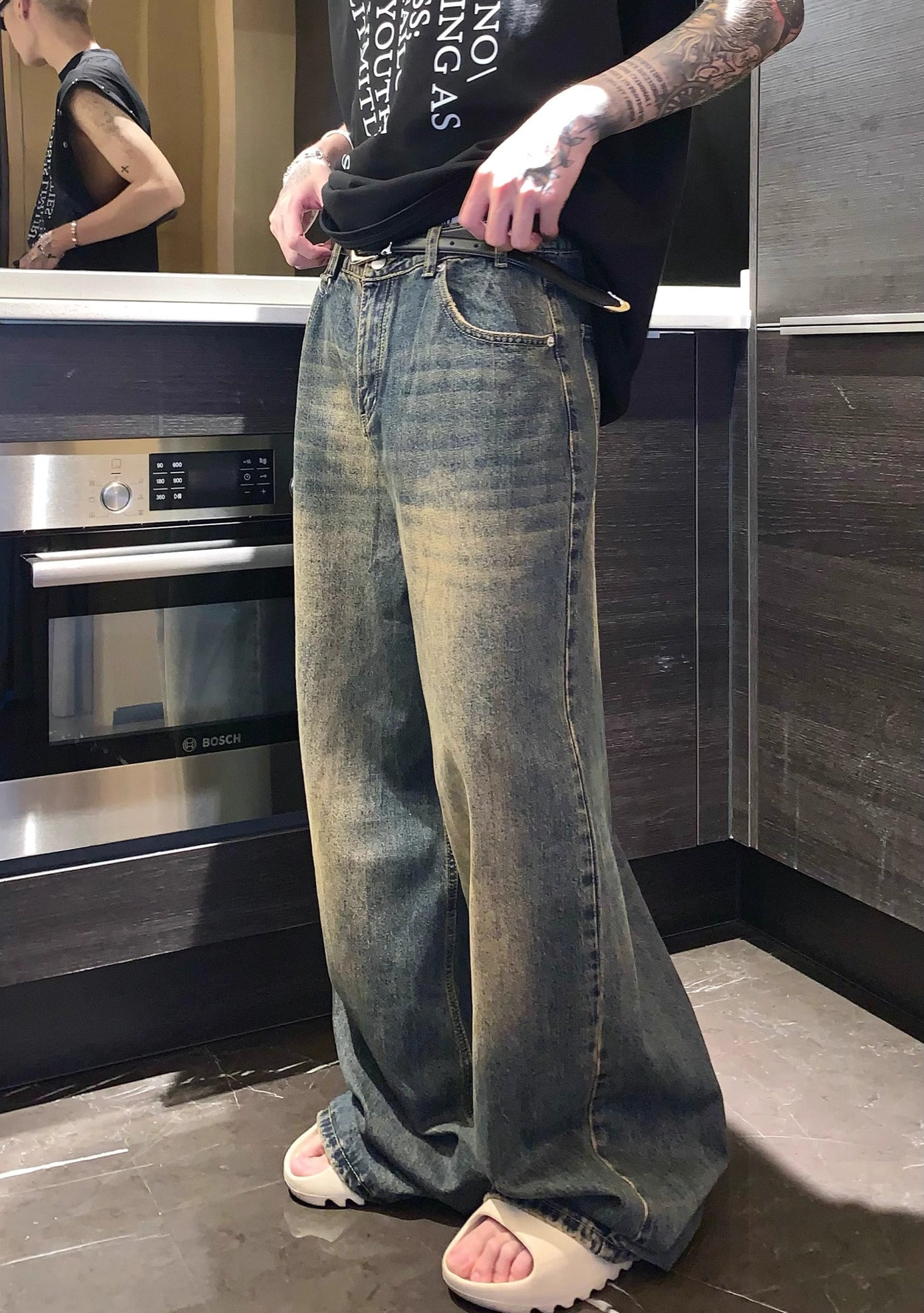 These wide-leg jeans come with a dirty vintage wash, full-length stack, and raw edge attitude. The graffiti fade effect and rugged wear details give you that grunge-heavy, skater-underpass energy – no fakes, just pure drip.